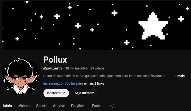 Pollux – Cria conteúdo sobre teorias em desenhos animados e é um amigo pessoal meu, tem vídeos com mais de 300 mil views e faz só o que gosta.